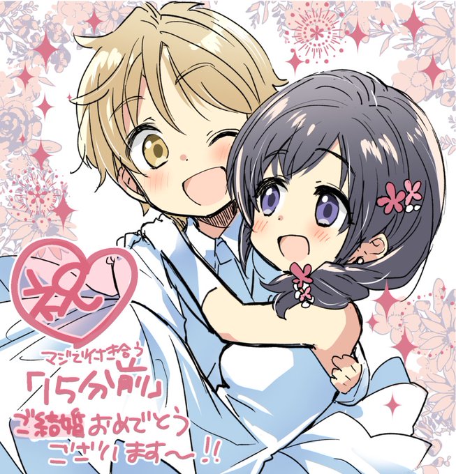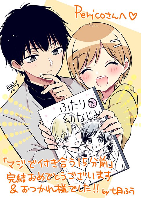 #マジで付き合う15分前 たまにお手伝いさせていただきつつ私も長いこといち読者として見守らせていただいていたので感無量です…主人公ふたりは以前描かせていただいたのでここはあえての奈央ちゃん&宗助くんを描かせていただきました!(Love…)完結本当にお疲れさまでした!