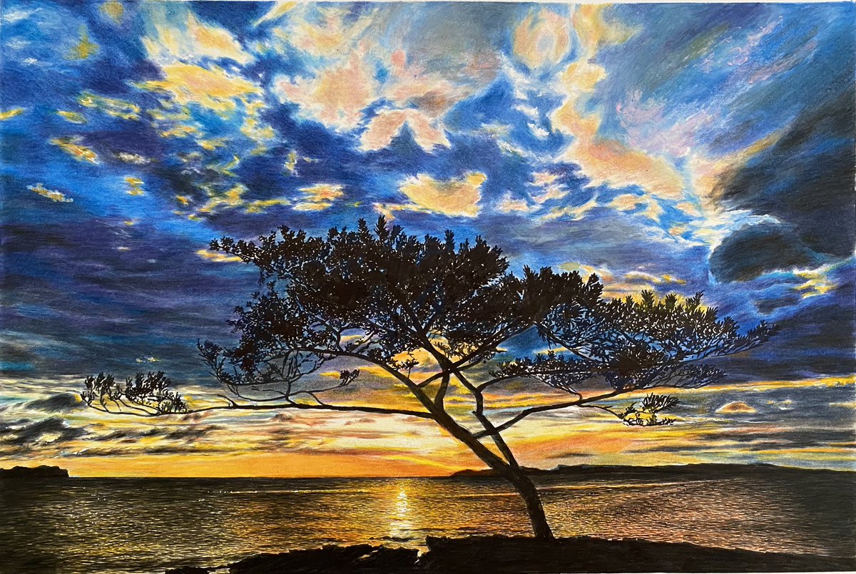 制作過程、海に着手。 A4ケント紙に色鉛筆。 #トワイライト #マジックアワー #夕陽 #夕暮れ #色鉛筆 #illustration #Illustrations #illustrationartist #art