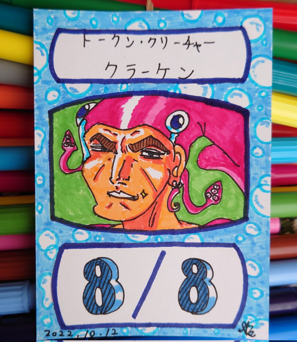 今日の一枚 (塗り終え日 2022年9月2日) 朝になっちまった…。 いいか、休みの日は夜更し! #クラーケン #アロエ #MTG #マジックザギャザリング #マジック・ザ・ギャザリング #トークンメーカー #らくがき #色鉛筆イラスト