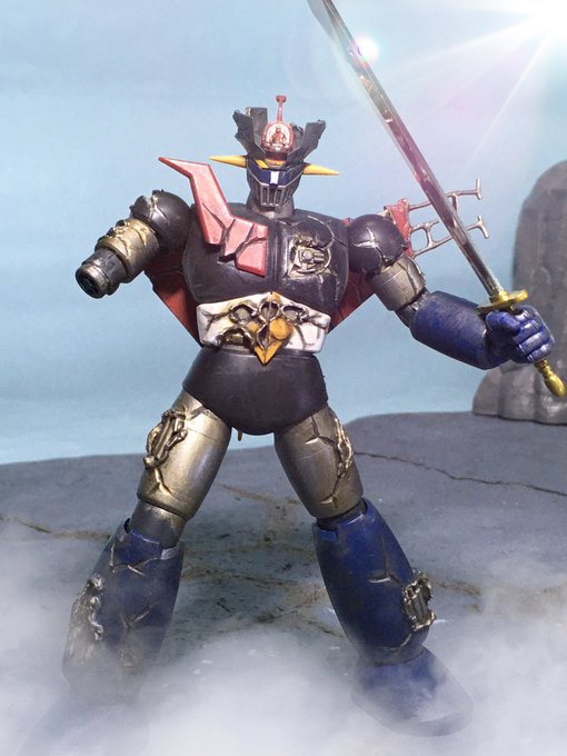 #夜のフィギュア撮影会 お題『剣』 明日50周年!剣を構えたマジンガーZダメージVer. !(← 超合金魂D.C.じゃなくてメカニックコレクションの改造) #マジンガーZ #マジンガーZ50th #マジンガーZ50周年 #メカニックコレクション #プラモデル #模型 #オモ写
