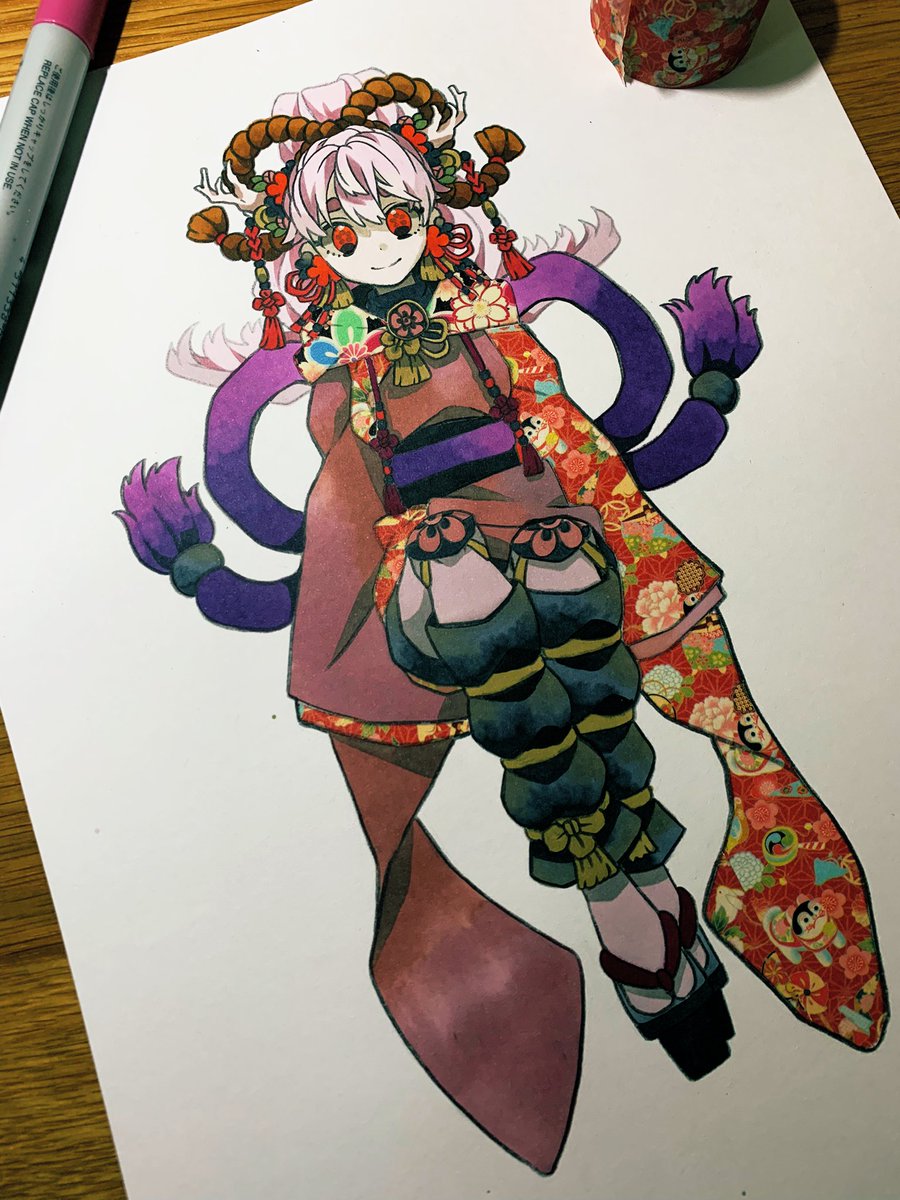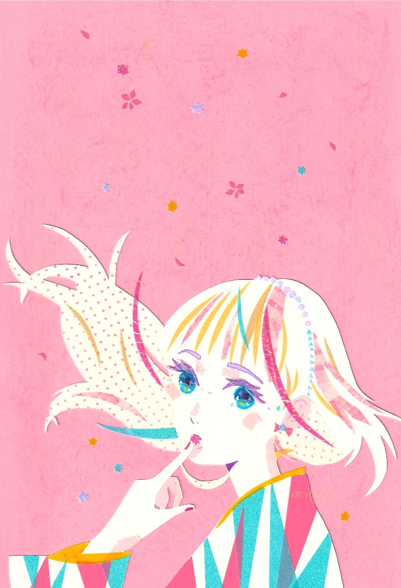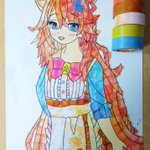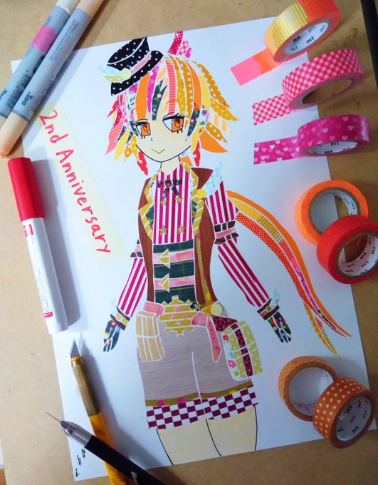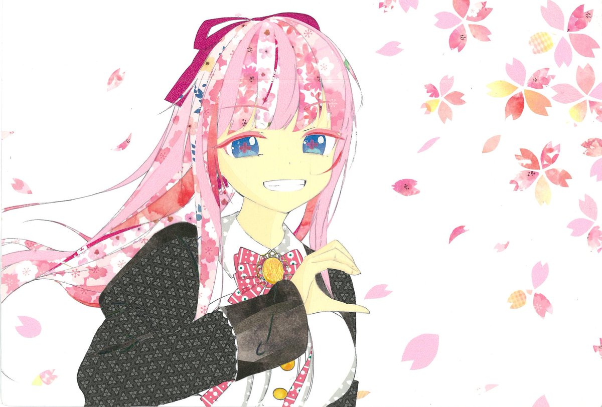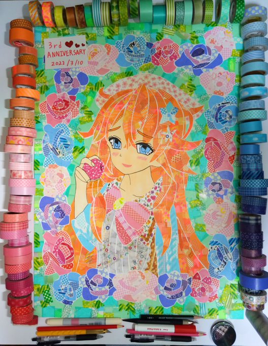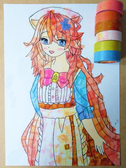 るーさん(@rascala39)の線画をマスキングテープで塗ってみました! ちえりちゃんの表情が最高に可愛い😊 背景は桜をイメージして描きました #花京院ちえり #ちぇり絵 #イラスト #絵描きさんと繋がりたい #イラスト好きな人と繋がりたい #マスキングテープ #マステ #マステ絵