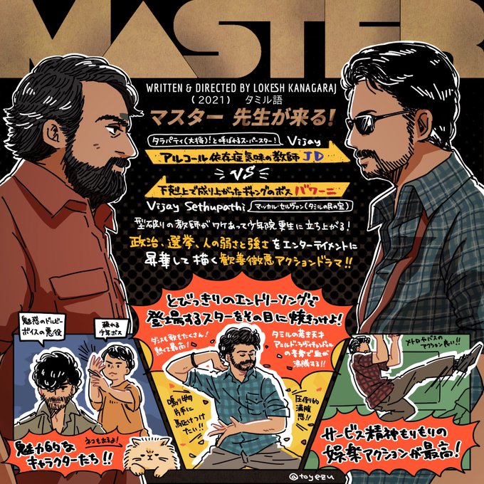 パズルの如く精巧な展開に魅惑的な悪役、沸き立つ音楽も最高だしとにかく映画が上手い! ダンスあり!アクションあり!そのうえ社会問題にも切り込む最強のエンタメ映画を数々ヒットさせてきた"大将ヴィジャイ"さんの #マスター先生が来る がついに日本全国一般公開ですよ!いろんな人に見てほしい!!