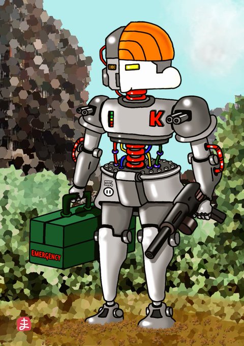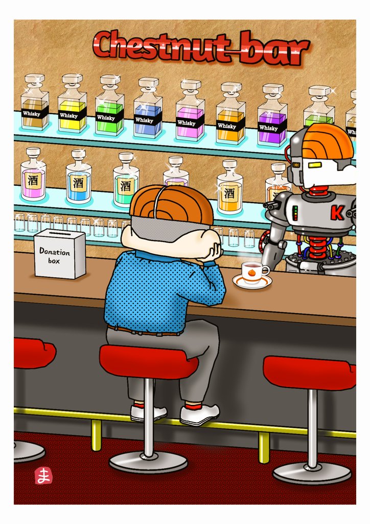 あ、100名の御入店(イイネ)ありがとうございます。 彼は元々戦争の最前線に立つ戦闘ロボ兵を後方支援、メンテナンスを専門とする衛生ロボ兵でしたので聞き役は得意。彼は自我を持ち、自身の存在意義に苦悩、第二の歩みとしてBarを経営することにしました。 #Chestnutbar #マスターK #イラスト twitter.com/matsu_uk/sta…