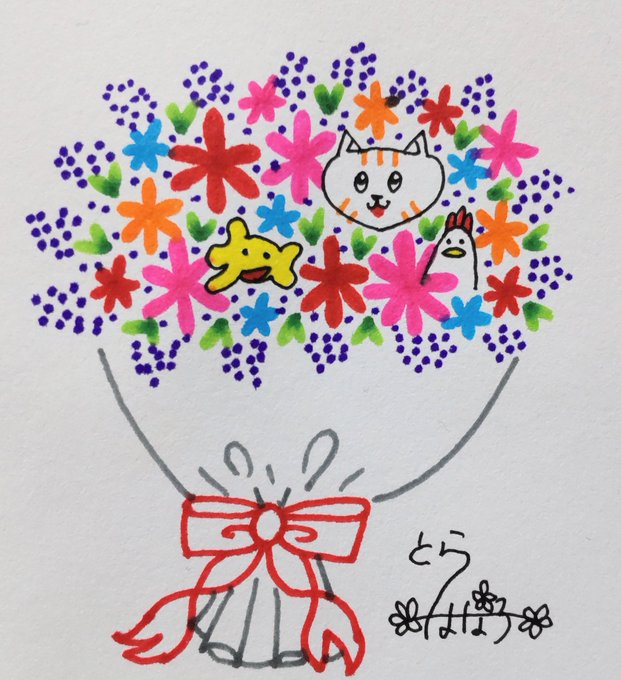 おはようございます!! 日頃の感謝を込めて花束をどうぞ💕 いつも、ありがとうございます!! 今日も素適な金曜日を〜🤗 #絵描きさんと繋がりたい #みんなで楽しむTwitter展覧会 #イラスト #油性ペン #マッキー