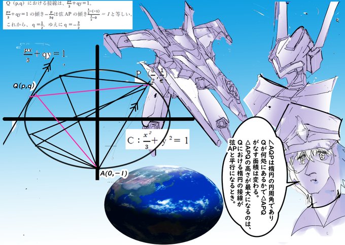 #みんなで楽しむTwitter展覧会 #WorldA_RT #マクロスΔ #YF29ブルーデュランダル #マクシミリアン #マクロスデルタ #マックス 楕円の円周上の点Qの接線が残りの円周上の点A,Pを通る直線と平行になるとき。接点(p,q)における接線px/3+qy=1の傾き-p/3qは弦APの傾きに等しいことからp、qを求める。