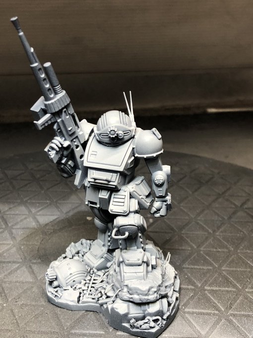 #マックスファクトリー #炎のさだめ 塗装を詰めて、これで完成。台に固定します。膝のステップが足も向きも逆^_^。瓦礫増量。足首の甲の装甲にリベット追加。肉抜き穴を埋める。塗装はブラックアンドホワイトののち、シタデルカラーで塗装。シタデルコントラスト多用。 #ガンプラジオ