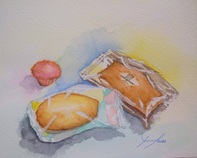 マドレーヌ、フィナンシェ… おいしいよね大好き🎶 #水彩色鉛筆 #透明水彩 #水彩画 #絵 #お菓子の絵 #マドレーヌ #フィナンシェ #watercolorpencils #watercolorpainting #stilllife #aquarelle