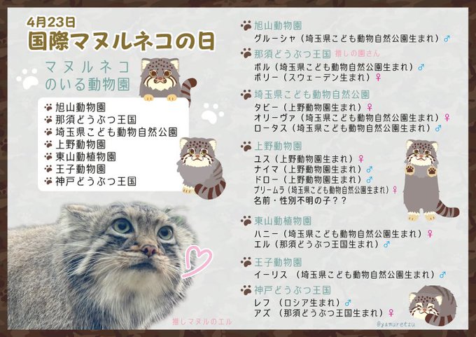 本日4月23日は国際マヌルネコの日です! 園さんがマヌルネコイベントしてられるとこもあるよー!写真は那須どうぶつ王国さんのボルくんと王子動物園さんのイーリスくんです! #マヌルネコ #国際マヌルネコの日