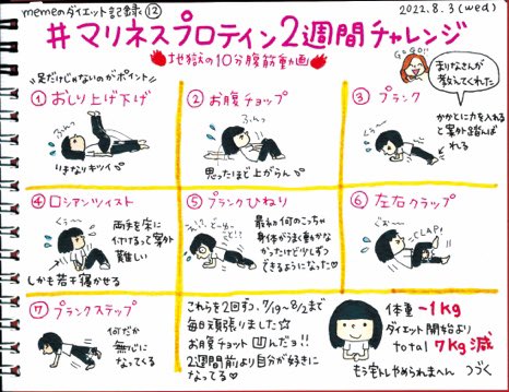 ダイエット記録12 昨日まで、まりなさん( @takemari1219 )の #マリネス2週間チャレンジ 頑張りました! せっかくちょっとお腹が凹んだので、出来たらこの腹筋プログラムは続けたいなぁ、と思ってます🔥 #絵日記 #ダイエット #マリネスプロテイン2週間チャレンジ #イラスト