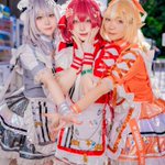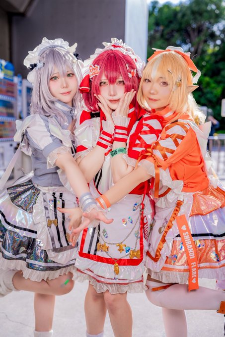🏴☠️御伽パセリ ⚔️大自然まか 🔥若竹煮千鶴 お姉さん組で3期生ライブ衣装コスしました🧡 こだわりポイントはなんと言ってもお揃いの布!3着分丹精込めて作成しました💪 これからも大好きです🩶❤️🧡 #マリンに届けEXPOコス