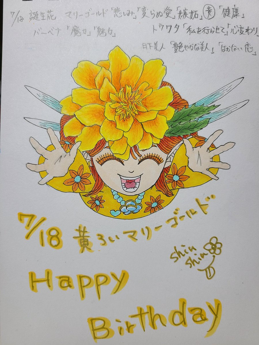 7月18日生まれの皆さん誕生日おめでとうございます😁😁✨ #毎日誰かの誕生日 #誕生日 #花の妖精シリーズ #誕生花 #花言葉 #毎日投稿 #イラスト #誕生日おめでとう #HappyBirthday #マリーゴールド #花のある暮らし #花 #illustration #handdrawing #fyp #オリジナルキャラクター