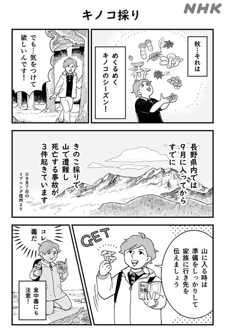 金曜夜8時です エヌむらです 食欲の秋 食欲の秋 食欲の秋 キノコ採りには注意してください イブニング信州でも 素敵な信州の秋を紹介しています nhk.or.jp/nagano/90th/co… #NHK長野 #マンガで見てみる長野局 #dollly