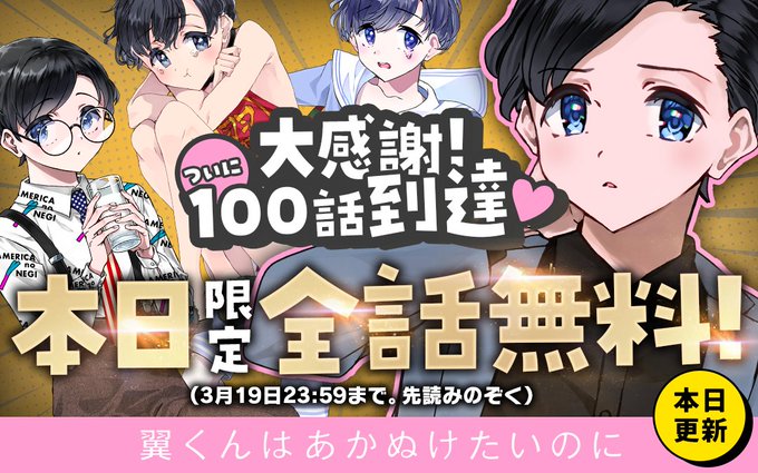 さらに100話到達大感謝ということで本日3月19日23時59分まで先読み以外の全話が無料で読めます!この機会に読み返してみたりお友達に勧めてみたり是非楽しんでください! #翼くんはあかぬけたいのに #マンガワン manga-one.com/title/86