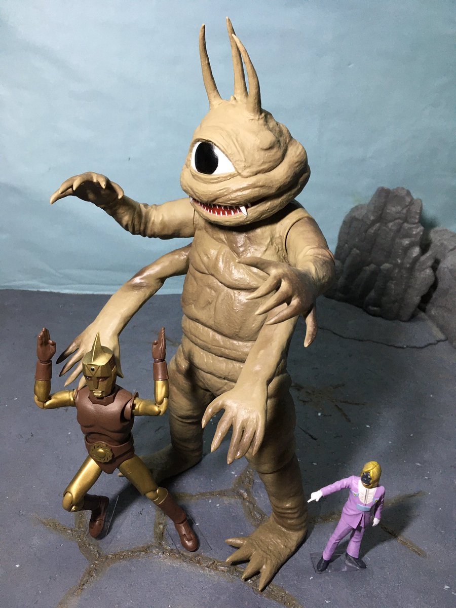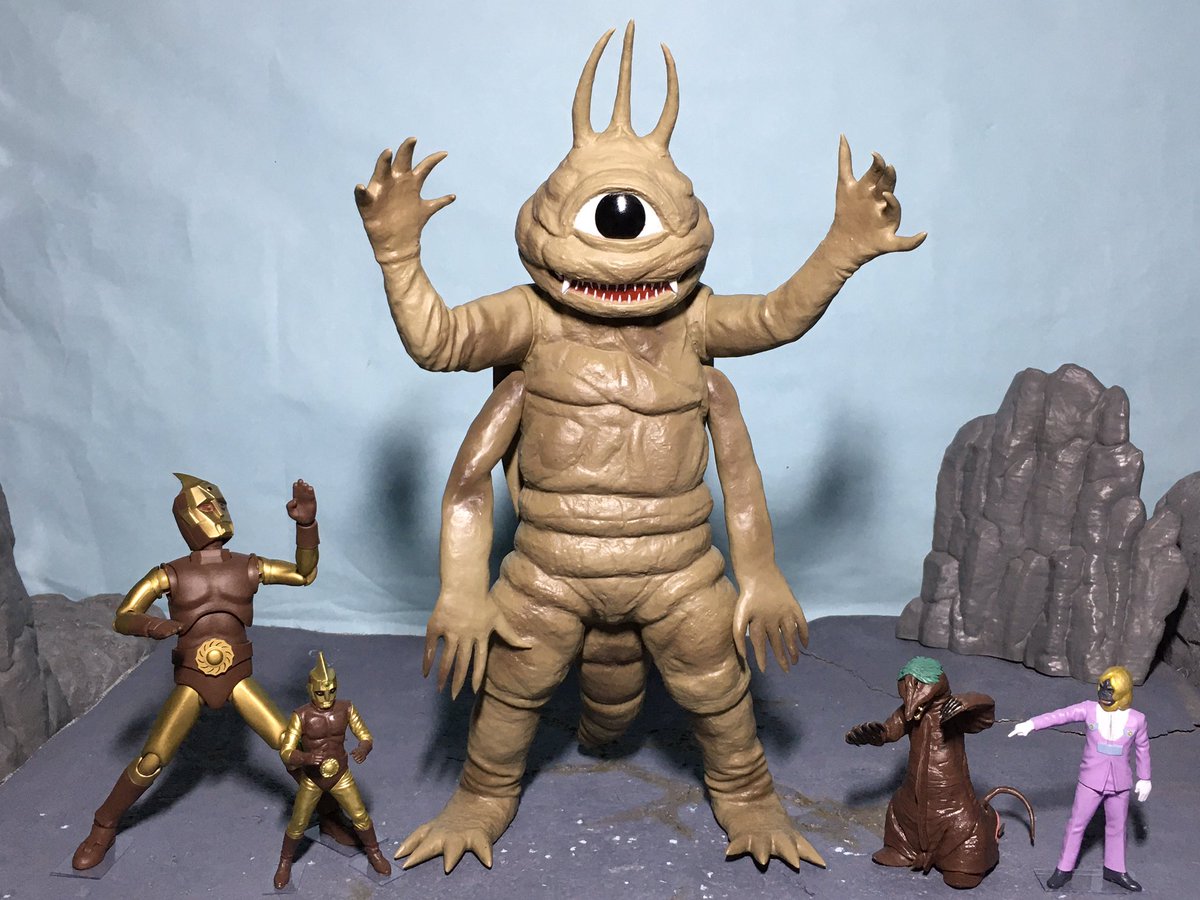 #夜のフィギュア撮影会 お題『フリー』 富士山より大きくなったスペクトルマンだけど・・バクラーもさらに巨大化して大ピンチ!?😆 #スペクトルマン #バクラー #Spectreman #マーミット #ソフビ #HAF #ヒーローアクションフィギュア #エヴォリューショントイ #富士山 #オモ写