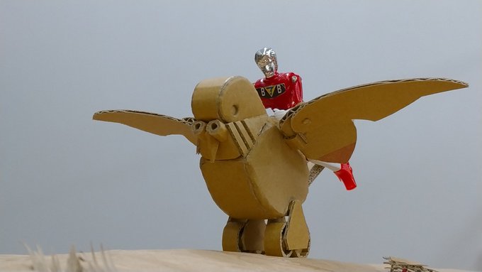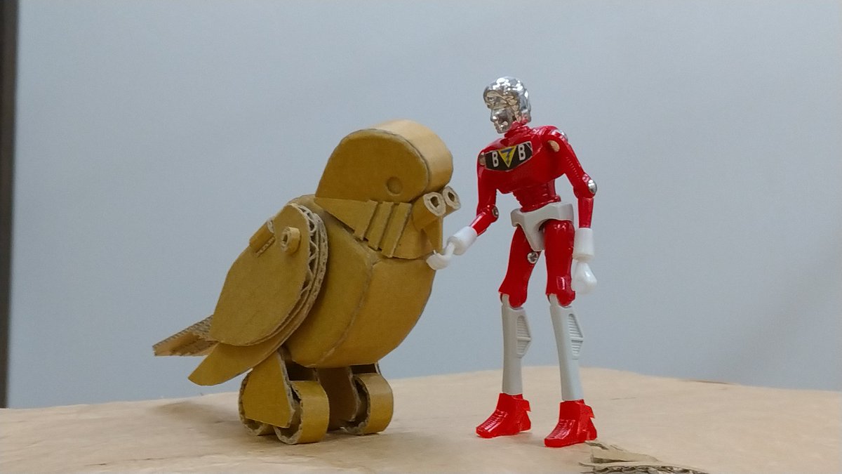 メカインコはミクロマンのお友達♪ アクロイヤー襲撃の際、流れ弾にあたってしまい瀕死の重傷のところミクロマン達によって改造手術を受け、メカインコとして甦ったのである♪ #ダンボールメカインコ #ミクロマン