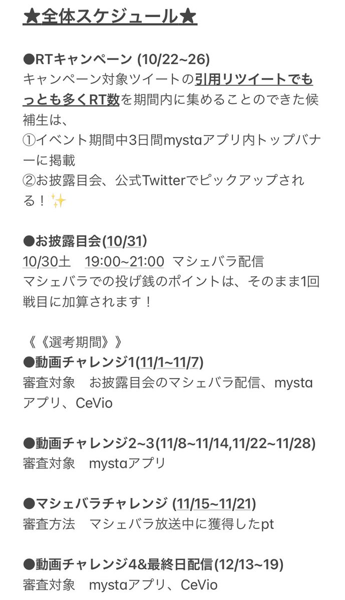 RTキャンペーンは今日まで! そしてその後は 10/30(土)19:00〜マシェバラでお披露目 11/1〜11/7 mystaで動画チャレンジ1回戦 という感じで続いていくので、 今のうちに 【mysta】と【マシェバラ】は ダウンロードしておいてね🐥🌼 #ミスジェニック2021 twitter.com/missgenic_myst…
