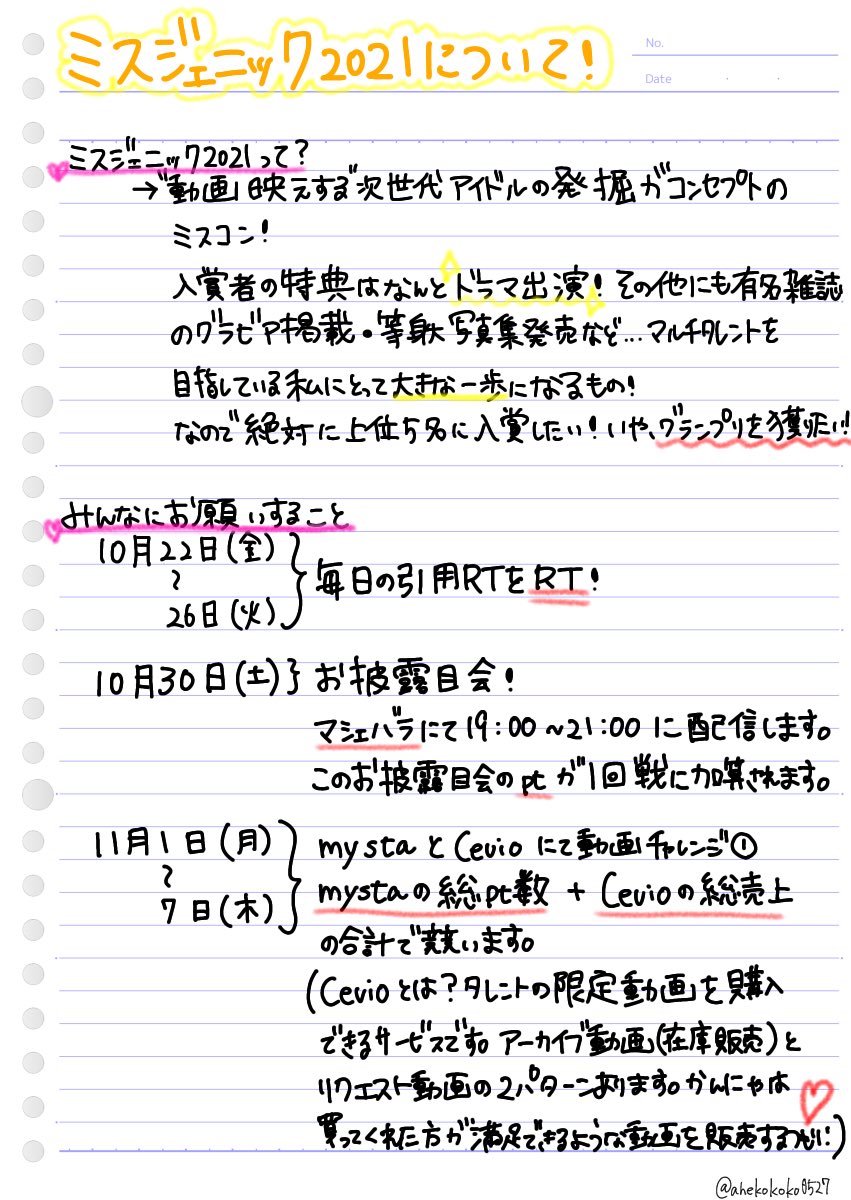 おはれーなんぼ🌼 今日も #ミスジェニック2021 mysta応援してね🐥💗 私がいるAブロックが激戦なので最近はランキング見るのが怖いよーう!🥲 ギリギリの戦いしてるので1人でも多く仲間が増えてくれることを待ち望んでますぞ!!😣🙏 詳しいやり方は下の引用RTから!⬇️ twitter.com/reina_koyama_/…
