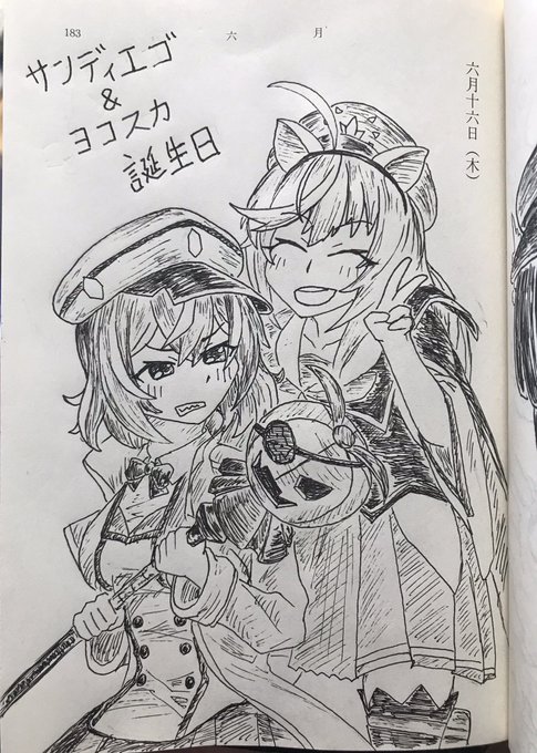 ヨコスカ&サンディエゴ #ミストレマイブックらくがき #びっくりお化け屋敷の仕掛け人の誕生日 #ワタシーの誕生日でぇーす 2人とも誕生日おめでとう!接点無さそうな2人だけどヨコスカがお化け屋敷体験するみたいで仲良さそうでなにより!