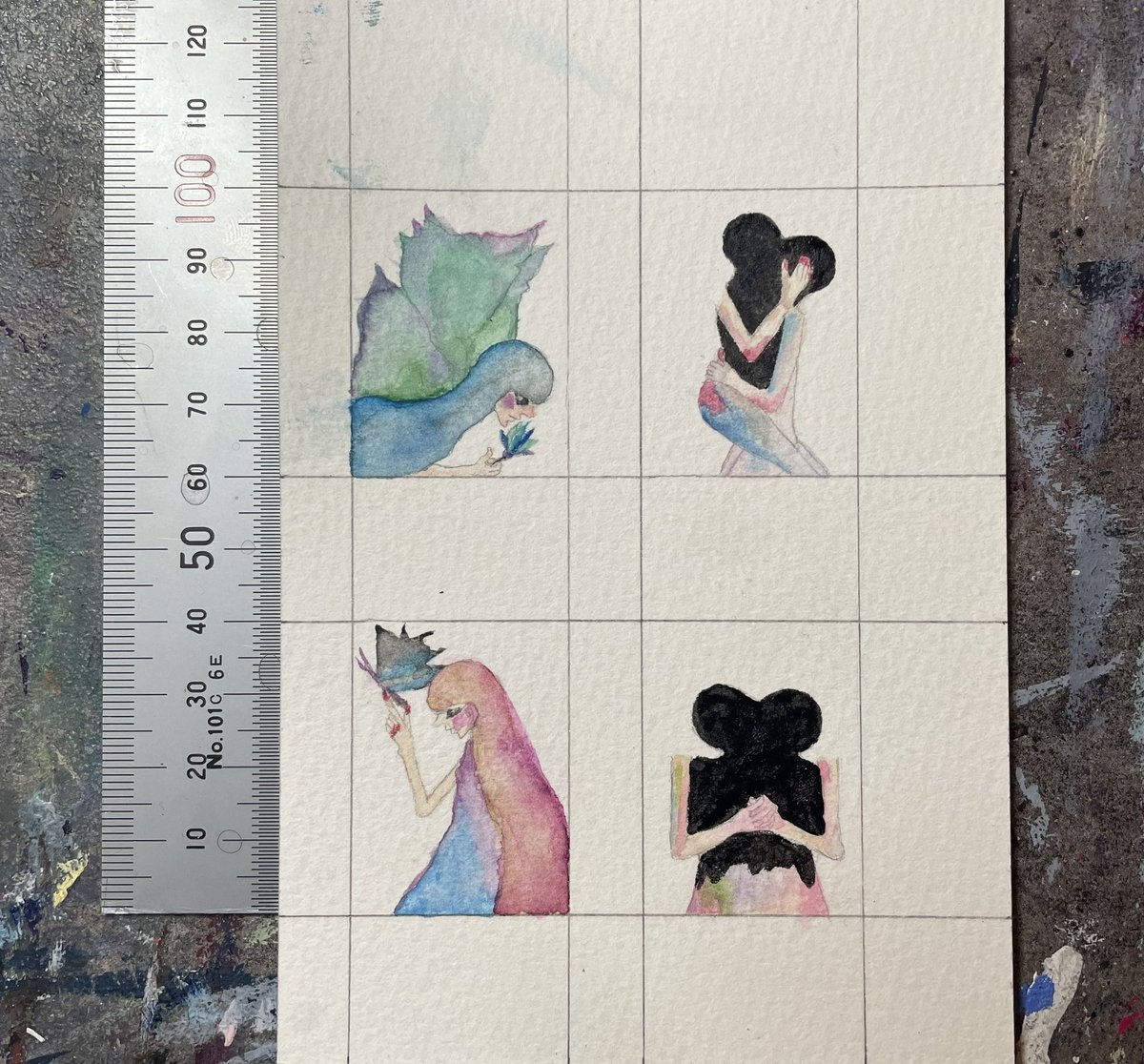 ミニチュア絵を4つ同時に描きました。 左上、花を求めて 左下、友達 右上、ブラックヘッドシリーズ、求め合う 右下、ブラックヘッドシリーズ、共に生きる 2023.March.19th #鉛筆画 #水彩画 Waterford 画用紙 #Pencildrawing #watercolorpainting #ミニアチュール絵 #Miniature drawing 3cm×4cm