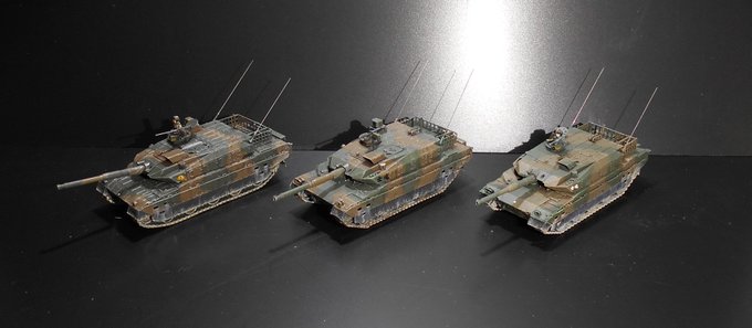 #Twitter模型総火演2022 #ミニスケール #ミニスケ 現在3つのメーカーから発売されてる1/72の10式戦車を並べてみました。左からウォルターソンズ、アオシマ、フジミのキットです。こうして見ると同じ戦車でも各メーカーごとに特徴があって面白いです。