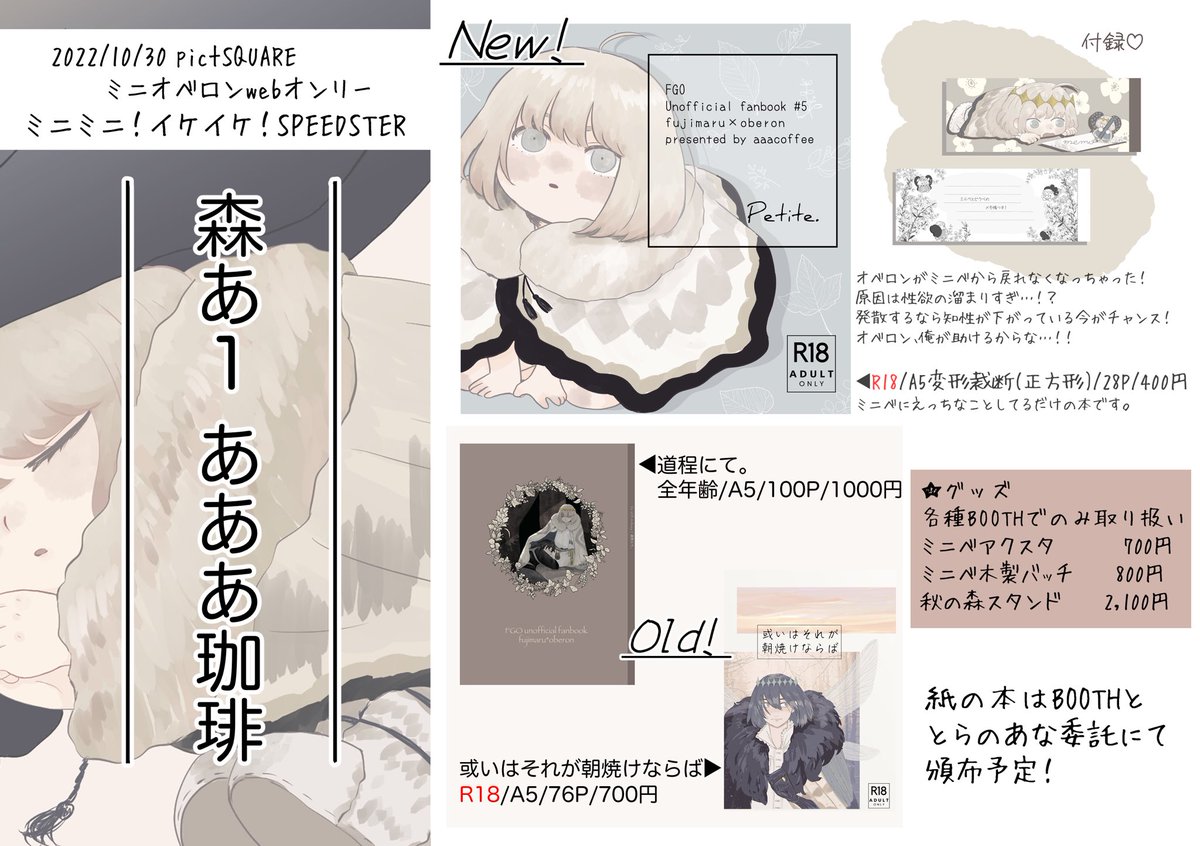 ついに来週10/30はミニベwebオンリー‼️ あああ珈琲は【森あ1】に配置されました。 森の奥の方でお待ちしてます♪ 頒布ページへは当日店舗よりご案内予定。エアスケブもできたらいいなって思ってます!楽しみ! 新刊サンプル▶︎ pixiv.net/artworks/10160… @minista_obe #ミニスタお品書き