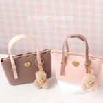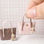 トートバッグを作りました💗🤎 何だかいちごチョコみたいな カラーになりました😋🍓 今回はくまのチャームを つけました🧸🍫 少し改良を加えて #ミニチュアアート展2022 で 販売予定です👜♡♡ どっちのカラーを販売するか迷います🤔