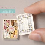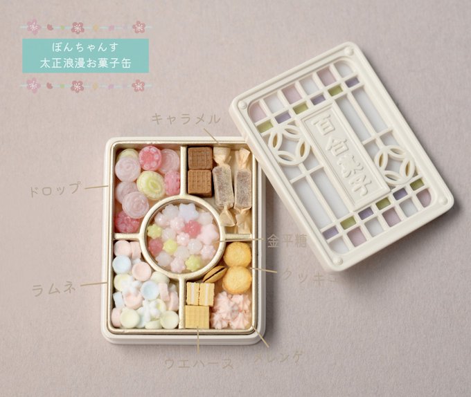 大正浪漫お菓子缶の 中身の詳細です🍮🤍 作るのが楽しくて楽しくて 夢中で完成させました🍨 お気に入りのお菓子が あれば嬉しいです(˶ ̇ ̵ ̇˶ )🌸 #ミニチュア #ミニチュアアート展2022