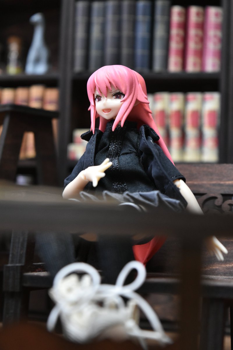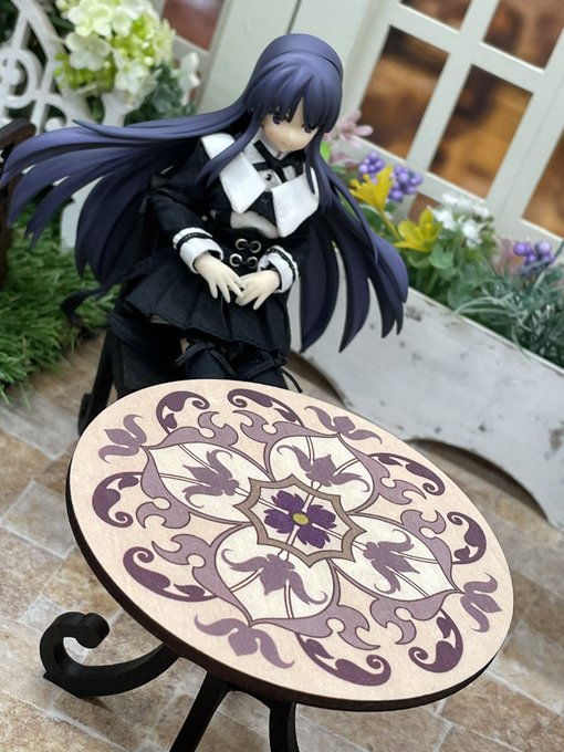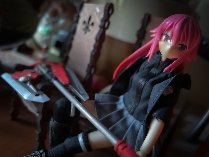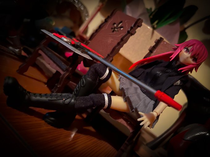 撮影会でお世話になってる #ミニチュアスタジオ からアサリ公式アイテムが出たとなれば買うしかあるまい! しかもめちゃかっこいい椅子!! 組み立ても一瞬でできたので、うちの子を座らせると…校章が隠れちゃってもったいない。他に何か……コレ? #AKG21 #アサルトリリィドール部 #カスタムリリィ