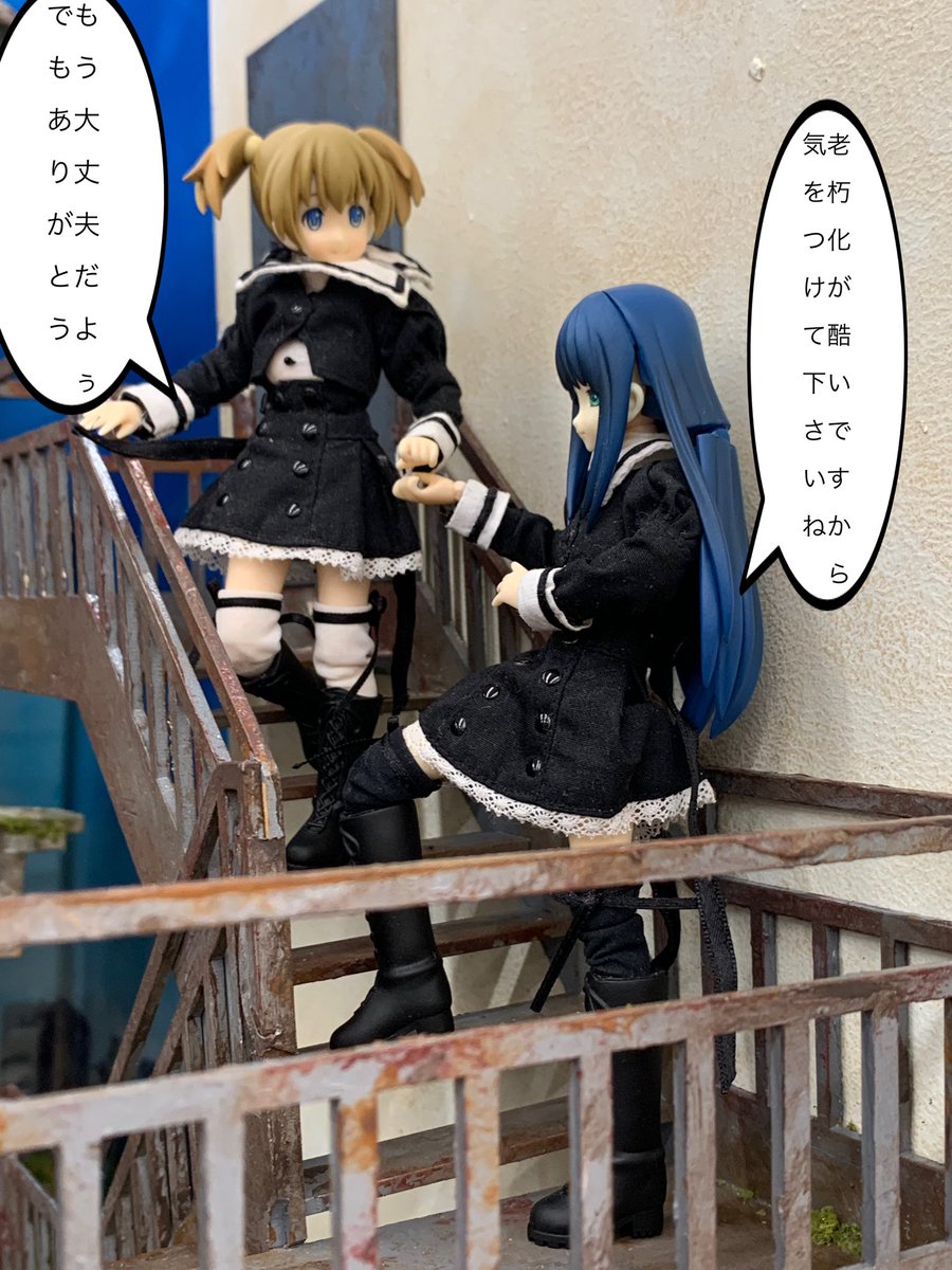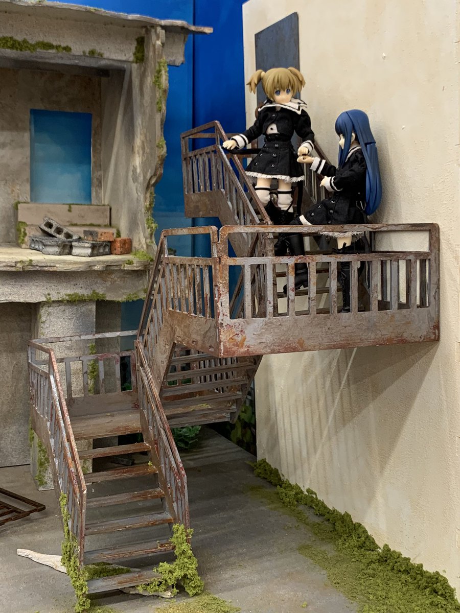 ミニチュアスタジオ様のジオラマで撮影させて頂きました! 階段のサビ具合だったり、ところどころ苔むしたところなど凄すぎて 何時間でも写真撮ってられそうでした😊😊 #ミニチュアスタジオ #カスタムリリィ #オリジナルリリィ #アサルトリリィ #アサルトリリィドール部