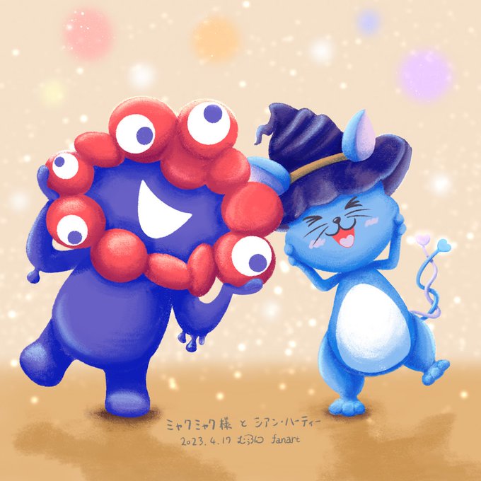 今日の通勤お絵描き🎨#ミャクミャク様 片足立ち可愛かったから、うちの子 #シアン・ハーティー もマネっ子😆♪ ミャクミャク様カワイイよぉ(*´ω`*)♪ ちゃんといつもの絵より、ちょっと多めに輝かせといた🌟 #絵柄が好みっていう人にフォローされたい