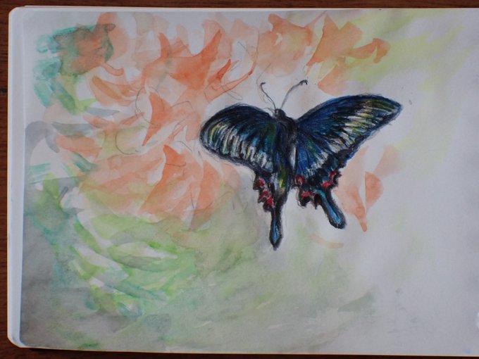 ミヤマカラスアゲハ♀(水彩+色鉛筆) 今年は会えるかな? #ミヤマカラスアゲハ #チョウ #水彩画 #色鉛筆 #イラスト #イラスト好きな人と繋がりたい #butterflies #natureart