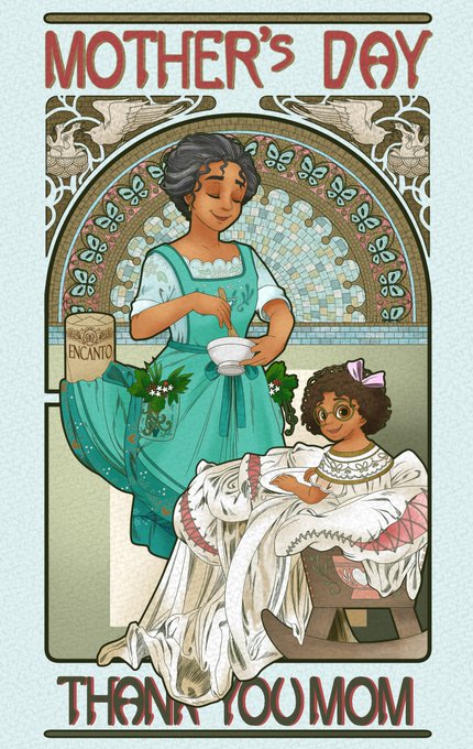 間に合ったーー!母の日イラスト完成💐一人暮らしだから、たまに母の料理が懐かしくなる気持ちを込めて✨ミュシャ作品【ネスレの乳幼児食ポスター】を、料理が得意なENCANTOのフリエッタでオマージュ💐 #Encanto #Julietamadrigal #Disney #MothersDay #母の日 #ディズニー #ミラベルと魔法だらけの家