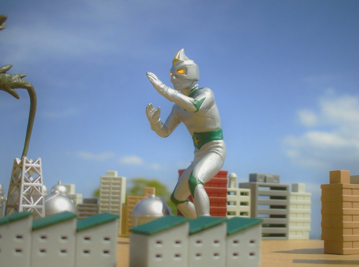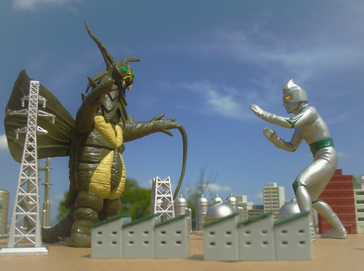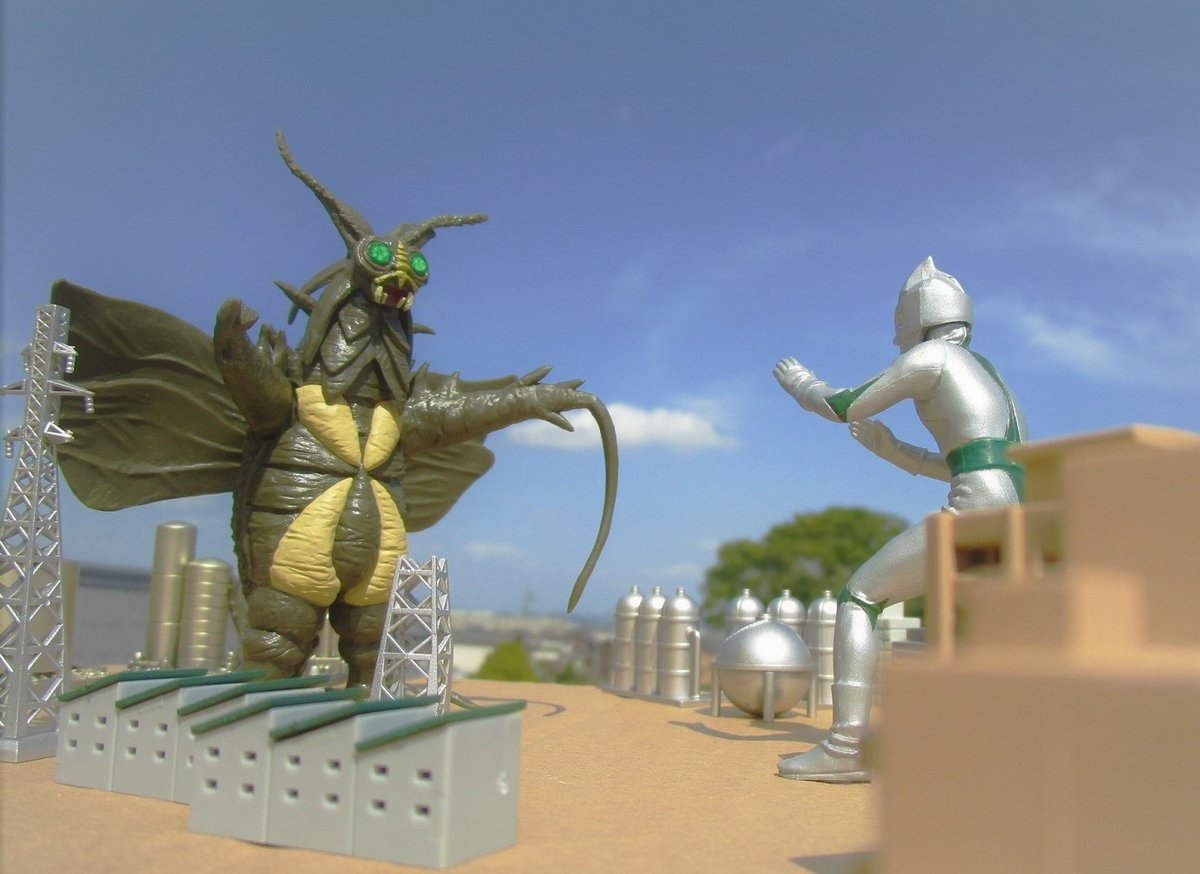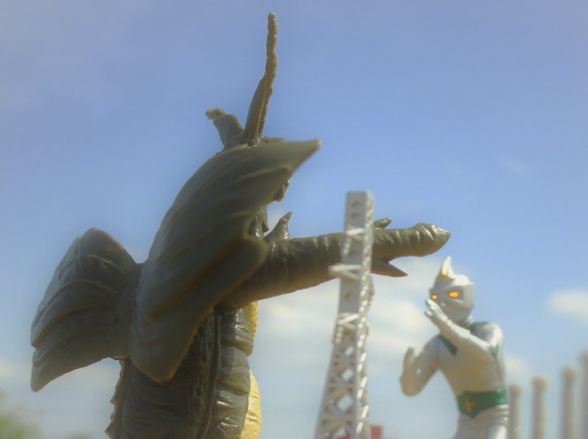 #夜のフィギュア撮影会 4/26 お題 『エンド/エイリアン』(新規) 侵略者・インベーダーの怪獣を倒せ! #オモ写 #toyphotography #HGミラーマン #ミラーマン #ダストパン #HGストラクチャー #ちいさな巨大特撮