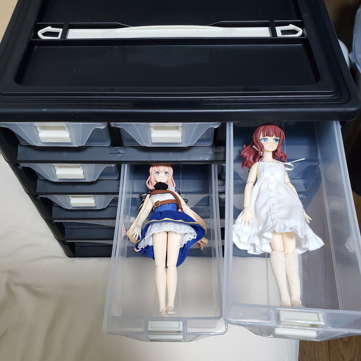 リリィを保管するケースを新しく買った。下段は広くなってるからミリアムも入るだろう。叶星様は髪の関係で高さ足りないだろうな。余裕をもって入る子だけ。擦れて塗料剥げてるリリィが二人いる故 #アサルトリリィドール部