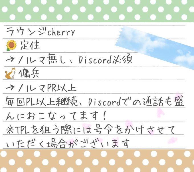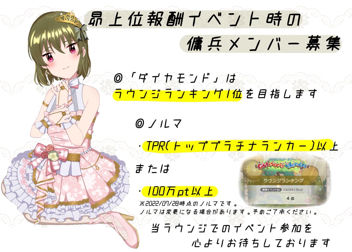 cherryではミリシタ6周年イベントに向けて傭兵さんを募集します!✨ ラウンジ目標→3年連続TPL ノルマ→アイドル別 100位以上(目標が高い方優先) ミリシタ6周年、最高に盛り上げていくので興味がある方はお声がけ下さい!🙌 質問や相談もDMで受け付けています!🙏 #ミリシタラウンジ募集