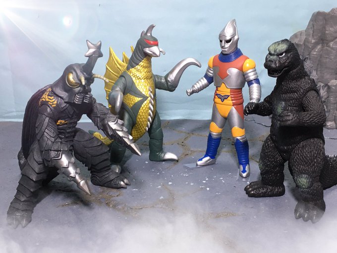 #おもちゃ撮影会 テーマ『お気に入りの過去作4枚』 シン・ウルトラマン、シン・仮面ライダー、3式機龍、メカ見え仮面ライダー! #シン・ウルトラマン #シン・仮面ライダー #3式機龍 #仮面ライダー #ムービーモンスターシリーズ #ソフビ #英雄勇像 #メカゴジラ #超合金魂 #バンプレスト #オモ写