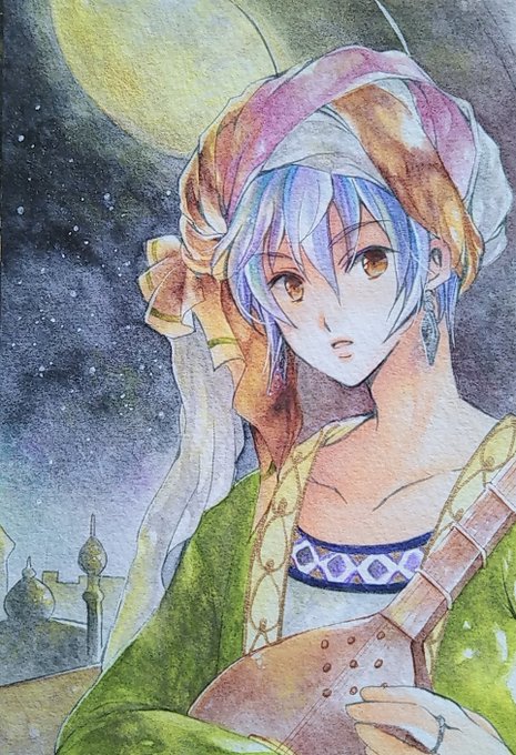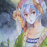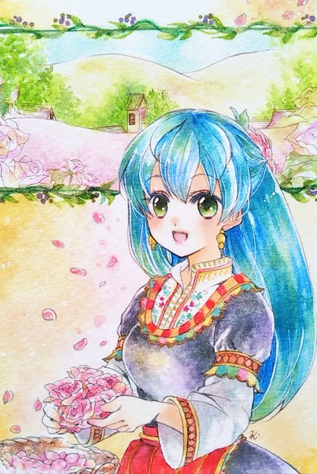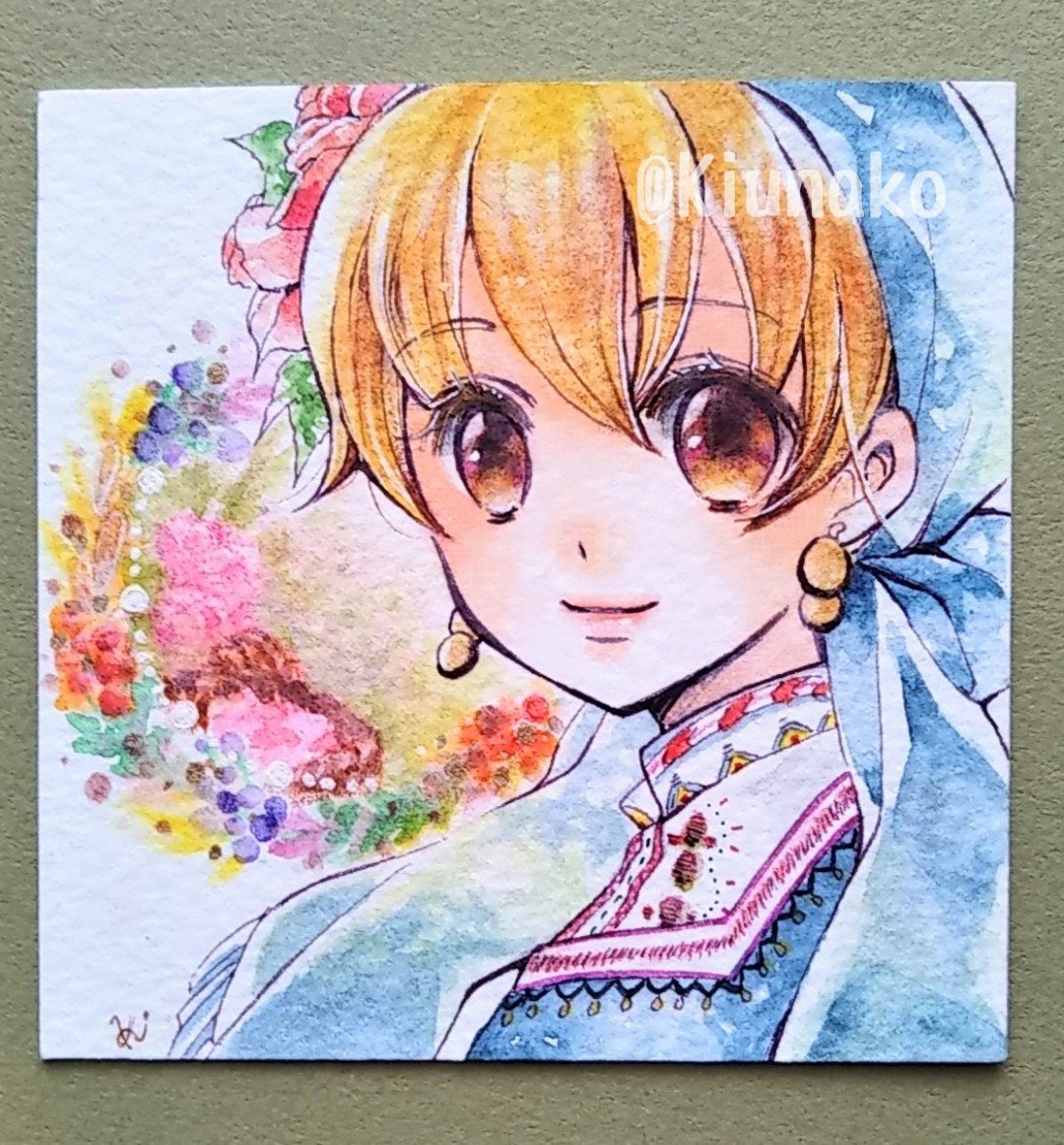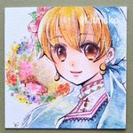 #ムーンハーベスト展2 バラの収穫祭2🏵 ウォーターフォード使用。80×80mmのミニイラストです☺️ 服はクサカベ透明水彩絵具のインジゴブルーをすごく薄めて塗ったんだけど、濃くても淡くても綺麗な色で好きです🥰 #オリジナルイラスト #水彩イラスト #水彩色鉛筆