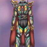 #メアルミスフィフス #オリキャラ 特殊装甲:ダイナストロン 「科学技術の進化には犠牲がつきもの…君達は実験動物というわけさ。」 長谷姉妹の次女、博士が 11体の恐竜やその仲間の力を宿したカセット、ダイナソウラーをガイアライザーに差し込み変身した姿