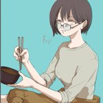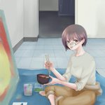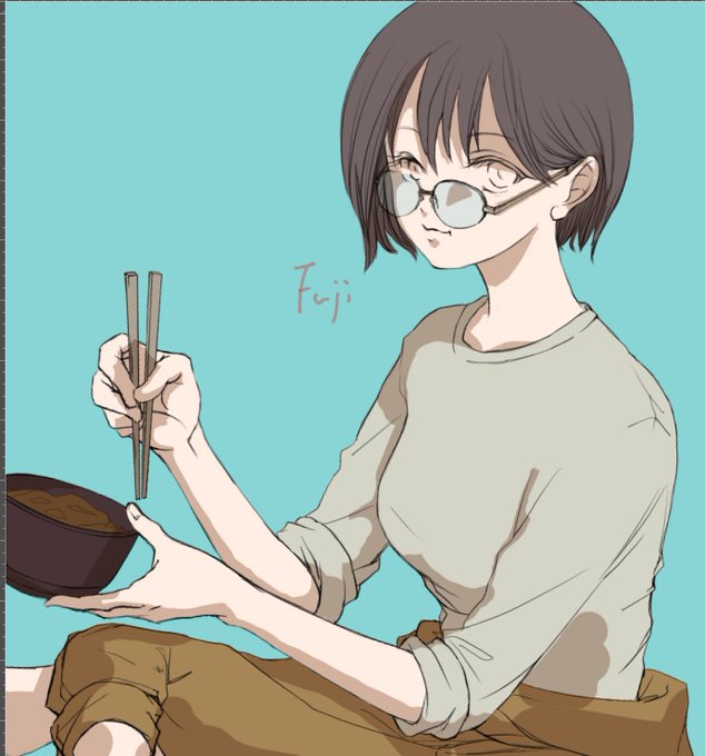 絵、描いてるとお腹すくよね って言いながら当然のように牛丼をもぐもぐするメガネ女子 #メガネ女子 #ツナギ女子 #美術女子 #牛丼女子 #絵柄が好みって人にフォローされたい #絵描きさんとつながりたい #デジタルイラスト