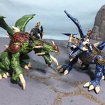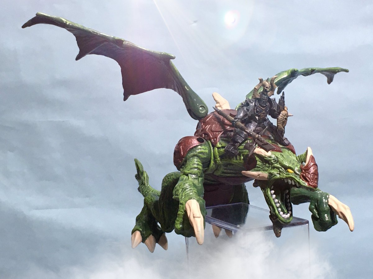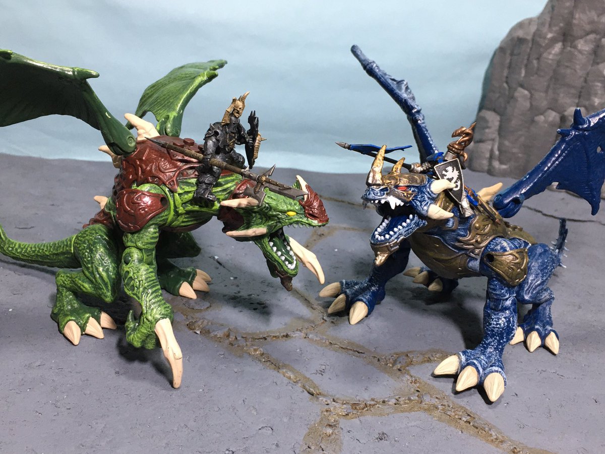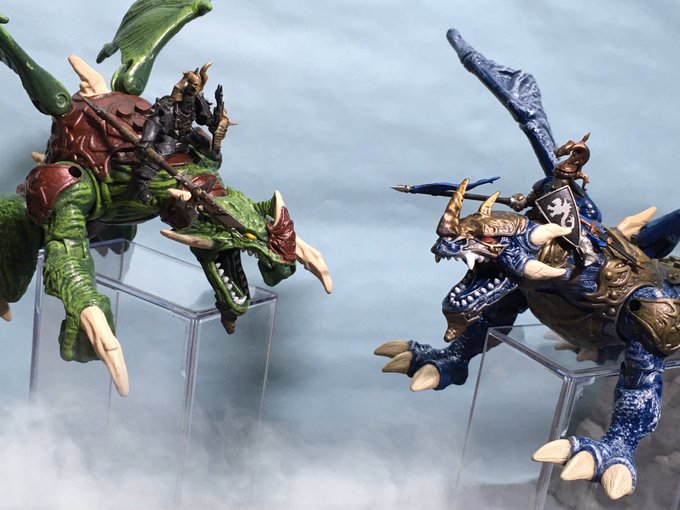 #夜のフィギュア撮影会 お題『コレクション』 珍しいコレクション!?戦う竜騎士!善と悪のドラゴンライダー!←昔のドラゴン・フィギュアにGWのミニチュアを乗せてみた😄 #メガブロック #ドラゴンエッグ #ブレトニア #ケイオスナイト #ゲームズワークショップ #ミニチュア #miniature #オモ写