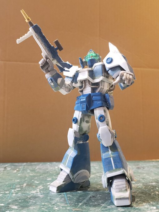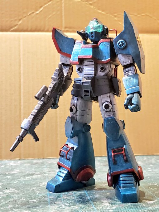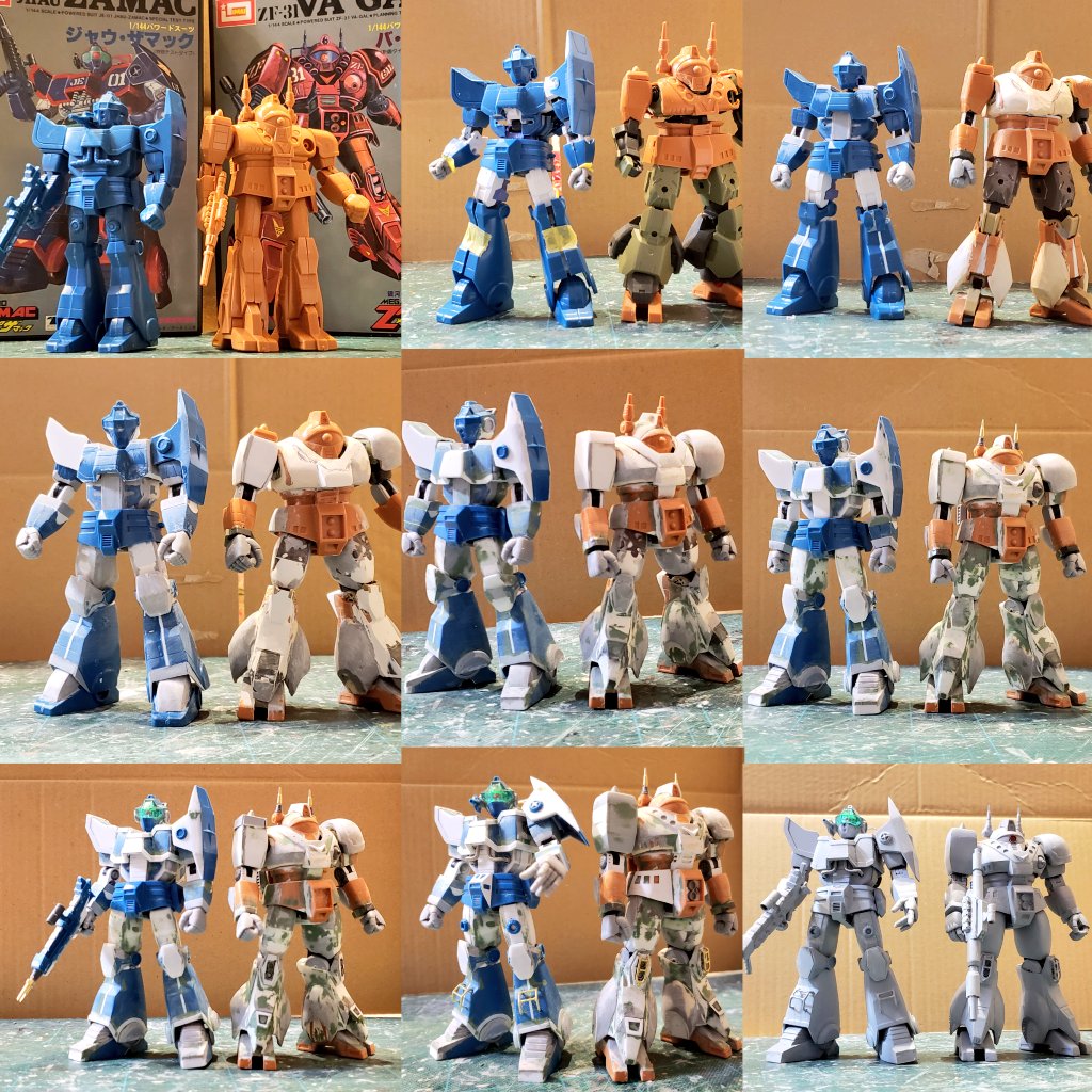 ジャウ・ザマック進捗!ライフルとイヤーガン、パイプ、手首バリエも揃えたのでパッケージポーズとらせましたがいかがでしょう?バ・ガルはスネ左右のインテーク4つをプラ板と瞬着パテで作成、貼り込んでエポパテ硬化待ちです。これでなんとかなるはず。。#酒餅12チャンネル #ロボマニ #メガロザマック