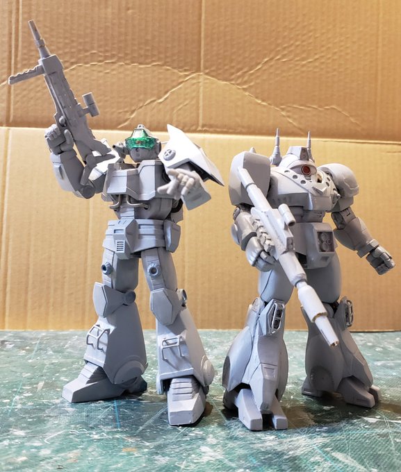 まだ終わらないジャウ・ザマック&バ・ガル進捗!スジ彫りはまだ途中です😅とりあえずビームサーベルなど作ってみたので2体でパッケージのポーズを再現。ディテールアップで動きが微妙に制限されたのですり合わせつつ表面処理とスジ彫り進めます。#酒餅12チャンネル #ロボマニ #メガロザマック