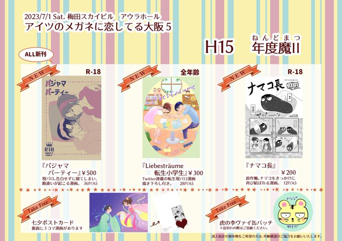 #メガ恋大阪5 おしながきです! 新刊が3種ありますので「転生」「パジャマ」「ナマコ」などとお申し付け下さい🙌もちろん、無配のみのお求めや、お喋りだけのお立ち寄りも大歓迎です! 当日まで何事もなければ、スペースH15でお待ちしております! 支部版→pixiv.net/artworks/10932…