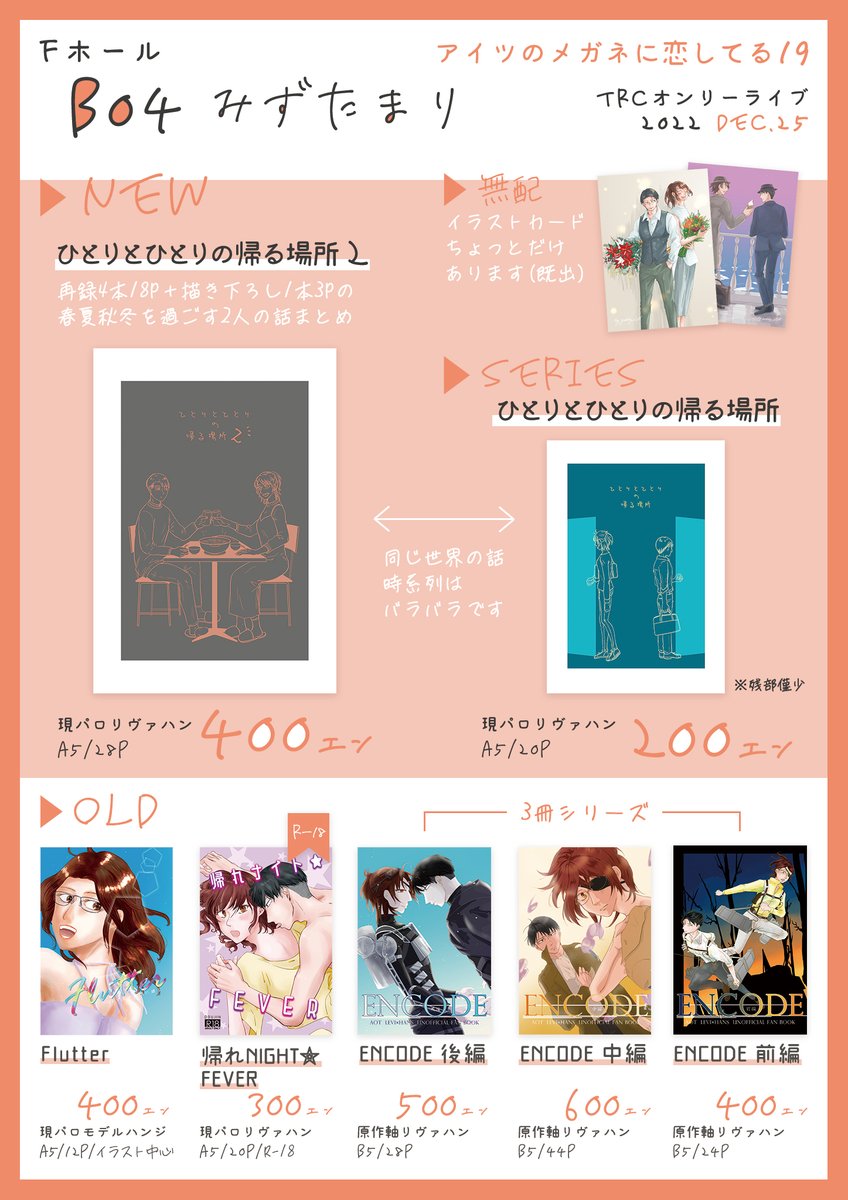 メガ恋19のお品書きはこちらです😌 pixiv.net/artworks/10376… テンパってると思いますが、気軽にスペースにお立ち寄りいただけたら嬉しいです💕新しいリヴァハンの民と絡んでみたいコミュ障古参兵なので…ぜひ! 当日はよろしくお願いします✨🙏 #メガ恋19