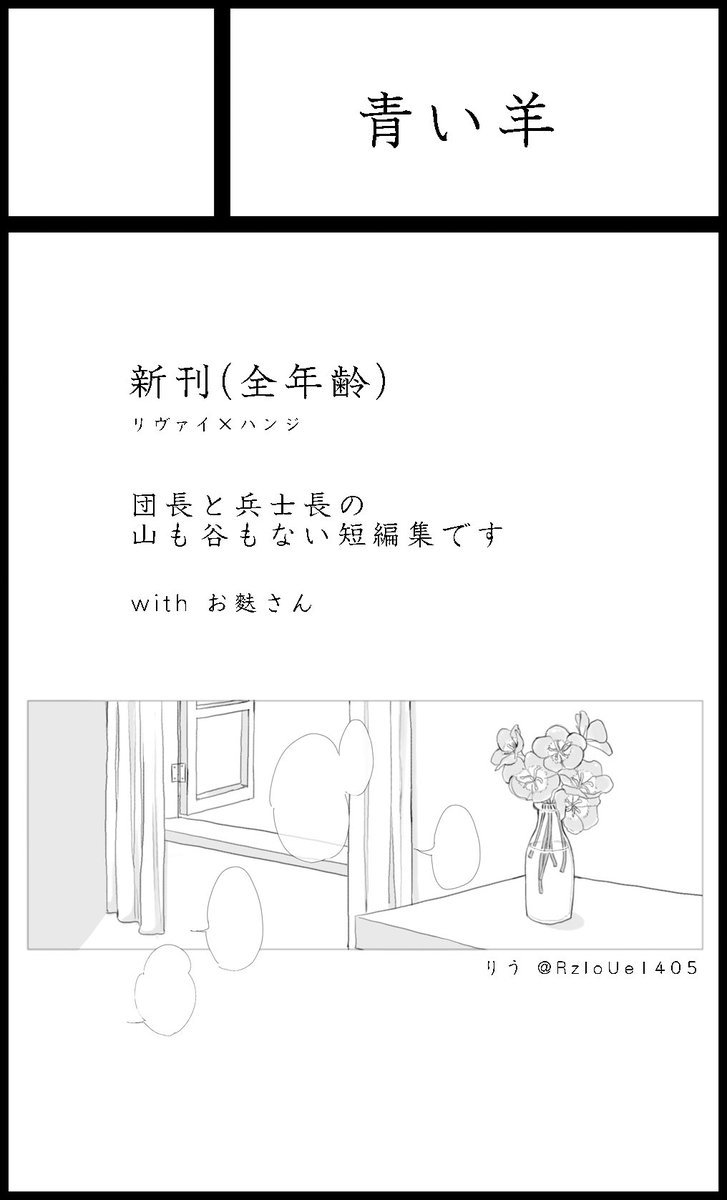 4月2日東京流通センター(TRC)【アイツのメガネに恋してる20】にサークル参加します! youyou.co.jp/only/_event/?i… #メガ恋20 団長ハさんと兵長リさんのぎこちない距離と変わらない愛のお話です(cp要素は極薄です) 初参加ですがよろしくお願いいたします〜☺️