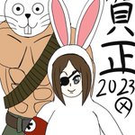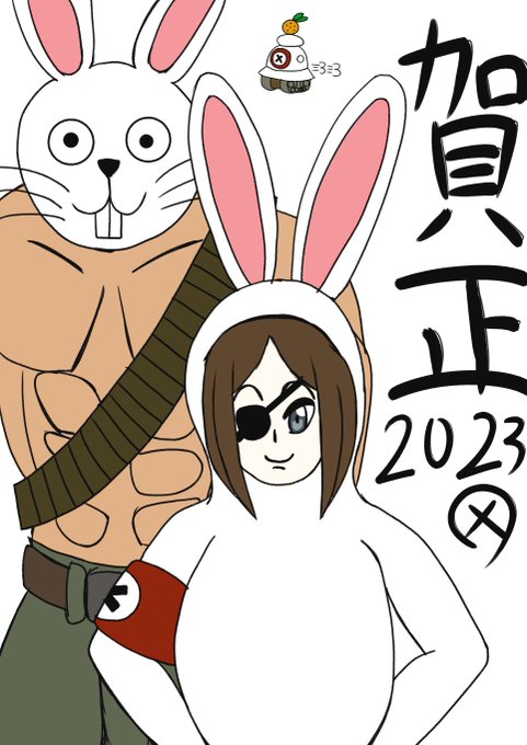 お正月イラストぜ! 本当は描くつもりなかったけど思いついたから描いたぜ! 今年の干支、ウサギの着ぐるみを着たモーデン元帥とオニール軍曹(曹長?)ぜ! みんなは餅を食べる時気を付けるんだぜ!(?) #MSA #MetalSlugAttack #メタルスラッグアタック #メタスラ #イラスト