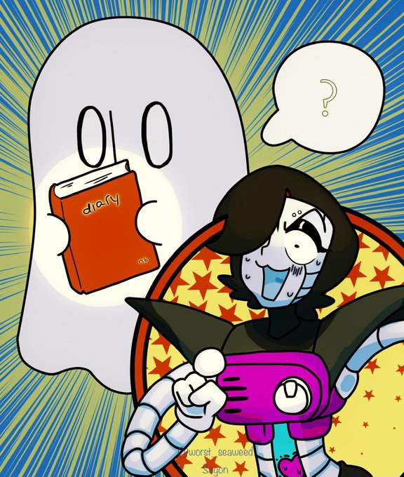 #メタトン版深夜の真剣お絵描き60分一本勝負 お題:「ナプスタブルーク」(Napstablook)+50min ブルっちが最近新しく買ったらしい日記帳を見るたびにコアが爆発しそうになるトン