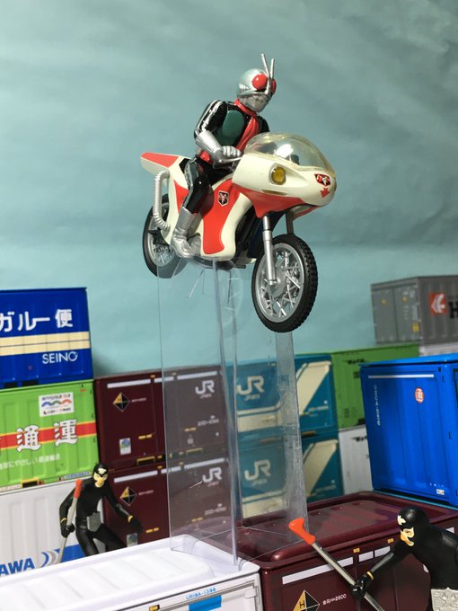 #夜のフィギュア撮影会 お題『音』 エンジン音を響かせて大ジャンプを決めるダブルライダー! #仮面ライダー #仮面ライダー新1号 #仮面ライダー新2号 #新サイクロン号 #メタルメカコレクション #ザ・ライダーマシン #オモ写