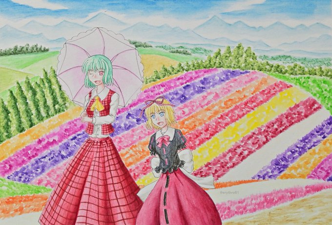 #東方Project #風見幽香 #メディスン・メランコリー 東方×旅行先の絵を描きました!今回は北海道美瑛町にある四季彩の丘を背景にしました! 広大な美しい花畑ですので、春や秋に是非訪れてみて下さい!