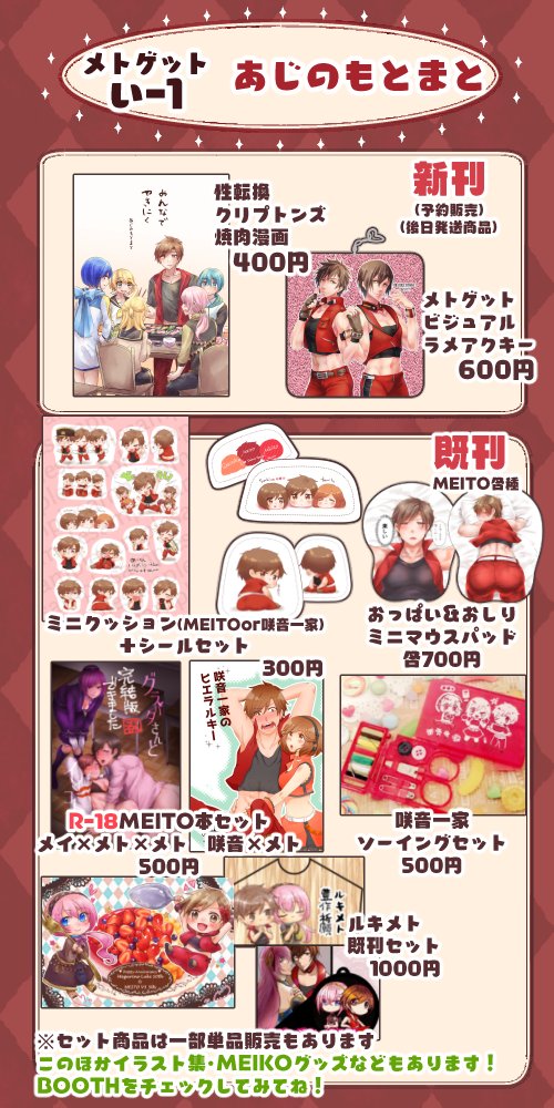 #メトゲット お品書きです!新刊何一つ間に合ってないため、既刊と一緒に購入された方は新刊とまとめて後ほど送る形になります。 また既存本・グッズはちょっとお得なセット価格販売もします。お品書きに載ってない既刊もあるのでぜひBOOTH見てください!→ajitomeito.booth.pm